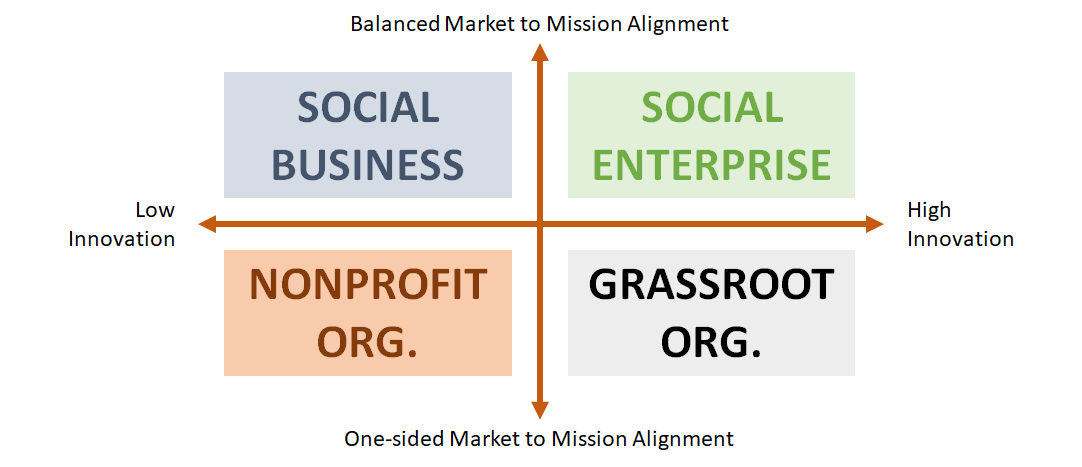 As is with any understanding, definitions help in further elaborating a picture. When it comes to types of social organisations, the following matrix helps identify each type according to its level of innovation as well as market to mission balance: